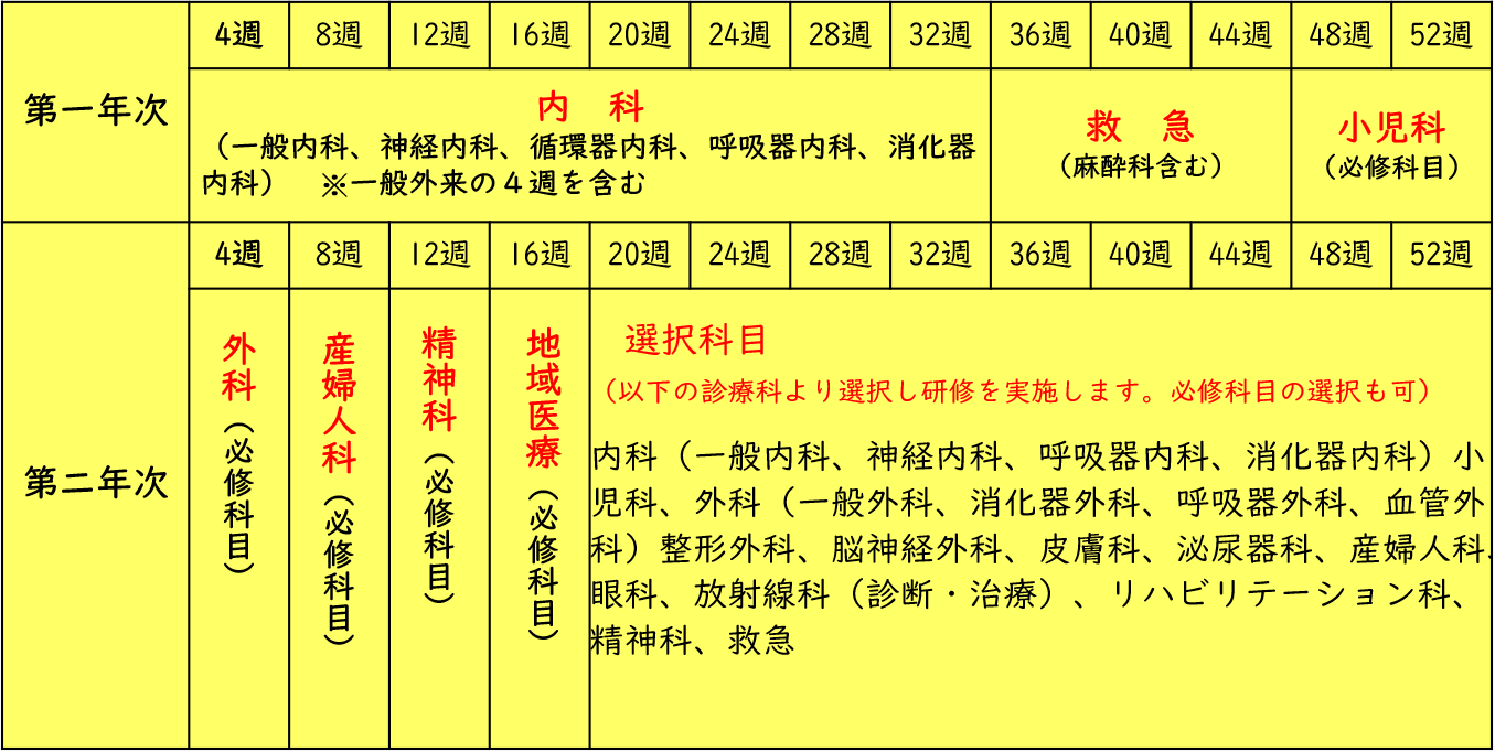 | 概 要 | プライマリ・ケアの基本的診療能力の獲得のみならず、医師としての人間性の育成を目指した研修を行う。 基本的な診療能力(態度・技能・知識)を、内科(一般外来含む)、救急(麻酔科含む)、外科、小児科、産婦人科、精神科、地域医療の研修により習得する。その後のローテートは、研修医の希望による選択科目又は必修科目の選択によって研修が行われる。 二年次に行う地域医療研修は、在宅医療等を実施している近隣の診療所(7施設のいずれか)で行われ、一般外来及び在宅医療等の研修を実施する。また精神科研修は、協力2病院のいずれかの病院にて行う。希望による循環器内科の研修は、浜松医科大学医学部附属病院又は静岡市立静岡病院のいずれかの病院において研修を実施することも可能としている。選択科目として内科の各専門科(一般内科、神経内科、循環器内科、消化器内科、呼吸器内科)、外科(一般・消化器)、整形外科、泌尿器科、皮膚科、脳神経外科、放射線科(治療・診断)、眼科等を選択する。それ以外に将来の進路にあわせて本人の希望に応じた科の選択も可能である。必修科目を再度選択することも可能。 関連する病院や施設の協力を受けながら、より質の高い研修が行われるように配慮されている。 |