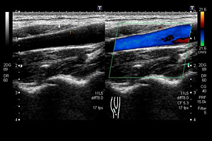 血管エコー検査は、血管の拡張・狭窄・蛇行などの走行状態、血管壁の性状、血流状態(流速・流量)を測定します。動脈硬化の程度が容易にわかるため、心筋梗塞や脳梗塞などのリスク判定などができます。