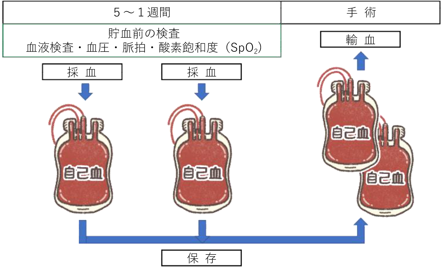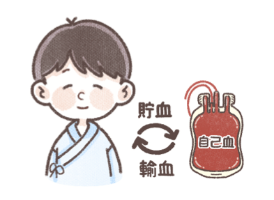 【自己血輸血とは?】 自分自身の血液を採取・貯血し、輸血に用いる方法です。 自己血輸血の種類には、貯血式自己血輸血、希釈式自己血輸血、回収式自己血輸血の3つがあり、どの種類を用いるかは症例により決まります。 3つの中でも最も多くおこなわれている方法が貯血式自己血輸血です。