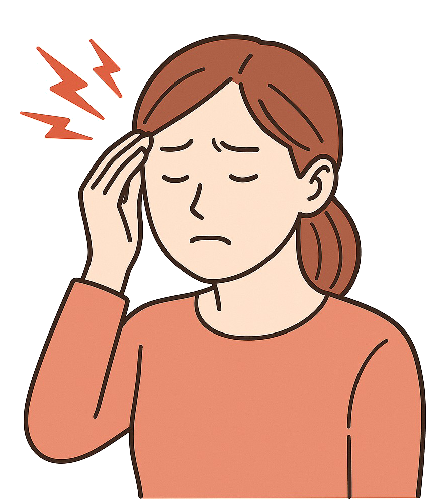 【顎と頭痛の関係】 ー 筋緊張性頭痛をご存じですか? 慢性的な頭痛の中には、「筋緊張性頭痛(緊張型頭痛)」と呼ばれるタイプがあります。これは、頭や首、肩の筋肉が緊張し続けることで起こると考えられています。 歯ぎしり・くいしばりでは、「側頭筋(こめかみの筋肉)」が常に使われ続ける状態になり、こめかみの痛みや、頭全体が締め付けられるような頭痛につながることがあります。 「頭痛薬を飲んでも何となく痛い」 「朝起きたときに頭痛がする、十分寝たのにスッキリしない」 「夕方になると頭が重くなる」 そのような方では、噛む筋肉の緊張が関与している可能性があります。